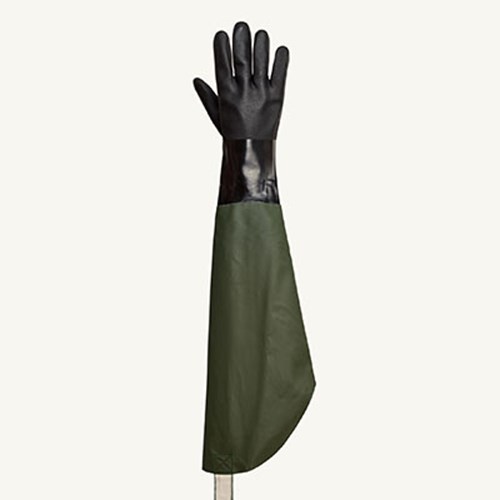 The SolvStop™ F294SL gloves offer chemical resistance and stay-in-place sleeves for full-length arm protection. Their double-dipped palms provide extra resistance to chemicals and solvents, and a flock-lined PVC material ensures they’re stiff enough to stay in place. Wide elastic straps that wrap around the neck further ensure the sleeves stay put. They also protect against oils, grease, acid, caustics, solvents, detergents, oxidation, and water.