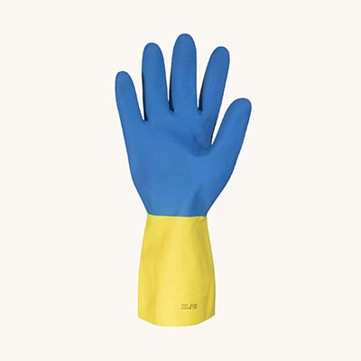 - Latex shell and neoprene palm coating protects against a wide range of chemicals and synthetic solvents