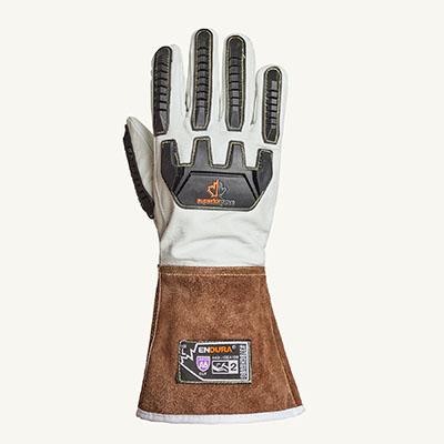 The Endura Pro™ 378GKGVBG feature padded palms for comfort when material handling and offer protection against cuts and impacts . TenActiv™ engineered yarn liner provides 360° cut resistance with ANSI A6 cut protection plus back-of-hand ANSI 2 impact resistance guards against knocks and bumps. Extended gauntlet cuffs provide additional wrist safety.