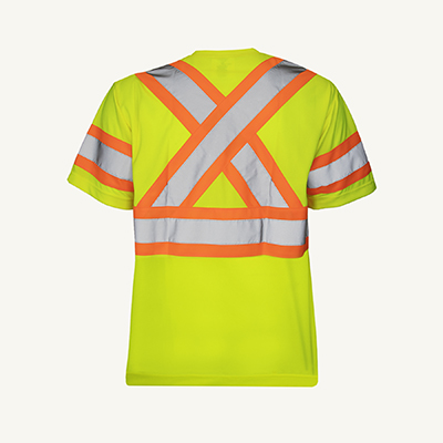 Hi-viz yellow traffic t-shirt with cross-back retroreflective stripes for 360° visibility