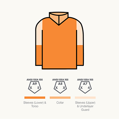 - Zoned cut protection with ANSI A9 cut-resistant torso and forearms, an ANSI A8 cut-resistant collar, and ANSI A7 cut-resistant upper arms and underlayer neck guard